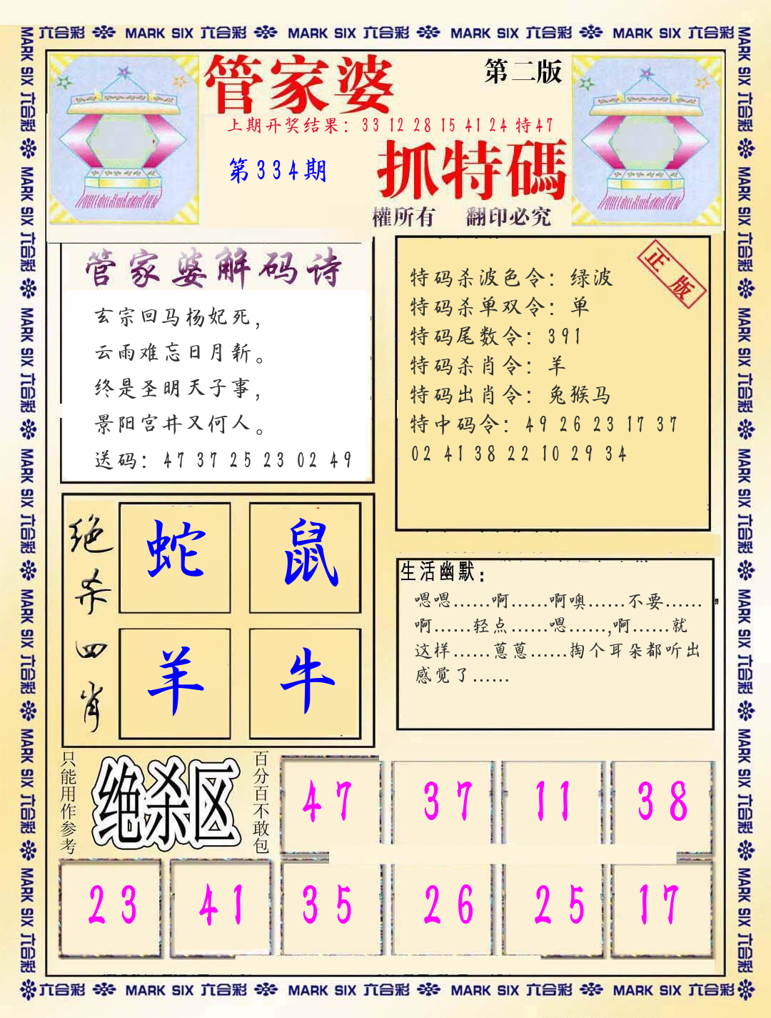 | 334期:新泰国六合彩四尾八码 开????? | |